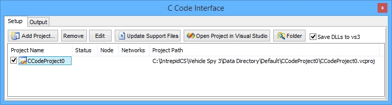 The C Code Interface is available from the Scripting and Automation menu in Vehicle Spy. This will open the C Code Interface view. The view consists of two main parts: a list of C code projects and an output window. Vehicle Spy supports multiple C code projects at once so you can add and remove projects to the list. The output window will display text written with a "printf" command in the C code project. You can also open the C code project by clicking the "Open Project in Visual Studio" button. When Vehicle Spy starts - all C code projects enabled (with a check box) will run.