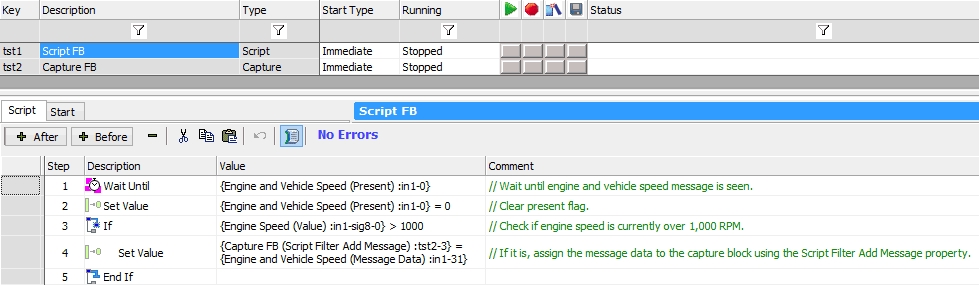 The first example, shown in Figure 2, is a simple one showing how you can arbitrarily set conditions under which data is captured. It is designed to run a simulation containing Engine and Vehicle Speed messages. The function block script loops continuously since it has no Stop command. Each time, the loop waits for a new message, then checks the value of the Engine Speed signal; if it is over 1,000, it executes the Set Value statement in step 4 to save the message to the capture block. Once the capture block has received a total of 2,000 messages, it will automatically stop and save its data to the disk. Of course this is a very simple condition: we are just checking for a single signal value. You have complete flexibility to make the script as complex as required.