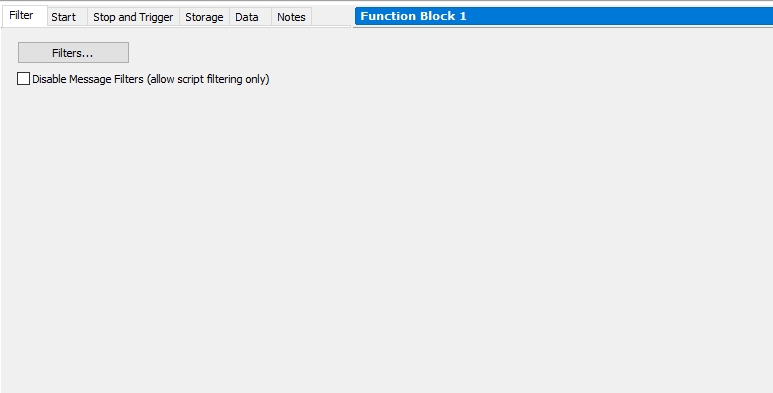 This is an advanced option for power users that provides complete control over exactly which messages are stored in the capture buffer, and under what circumstances. Instead of defining a filter using the standard Setup Filter dialog box, you use a Script Type Function Block in conjunction with a capture block to precisely determine which messages are saved.