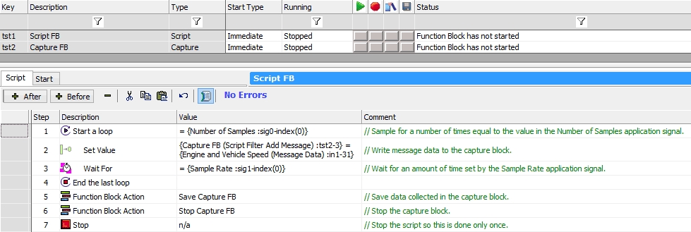 The second example (Figure 3) shows how you can use script filtering to do sampling of incoming data. We have defined two application signals; Number of Samples and Sample Rate, both of which are pretty self-explanatory. The function block script runs in a loop controlled by the value of Number of Samples. It saves one message to the capture block, then waits for a number of milliseconds dictated by Sample Rate before looping. When the loop is done, the capture block data is saved and both blocks are stopped using script commands.