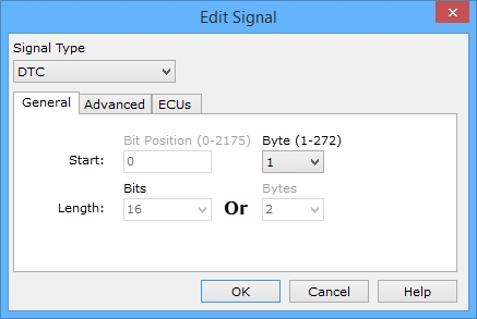 By setting up the Signal Type pulldown to DTC in the Edit Signal dialog (Figure 1), a DTC signal will be setup. Just select the Start byte where the DTC is located in the message and that's it!