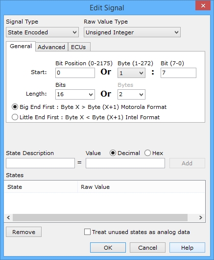 Use the state table area to enter a State Description and the decimal Raw Value it represents. Click the Add button to add the state definition to the States list. Additional state definitions can be entered quickly by just typing new State Descriptions and tapping the keyboard Enter key. Vehicle Spy will automatically increment the Raw Value field by 1 to help speed things up. Edit the Raw Value field at any time if some values need to be skipped.