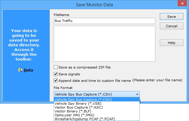 The buffer file can be saved in a .CSV or .VSB file format, among others. .CSV (Comma Separated Value) is a common format that can be read by many applications and it can also include signal data and a text note. .VSB (Vehicle Spy Binary) format is readable by Vehicle Spy and does not include signal data or notes. .VSB files have smaller memory size than .CSV files, so .VSB format can be useful when saving very large message buffers.