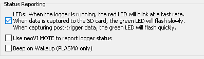 You can use the reporting options to monitor your logging activity. You may choose to use No Reporting, LEDs, a neoVI MOTE, and Wireless neoVI. No Reporting: If you choose No Reporting (by selecting none of the options), the device will use the default LED blink pattern (Flashing red LED indicating active CoreMini). LEDs: If you choose LEDs, the Red LED will blink at a fast rate when the logger is running. The green LED will flash slowly when data is being captured to the SD Card, and rapidly when capturing post-trigger data (if you are using Pre/Post Trigger Collection). See Figure 1.