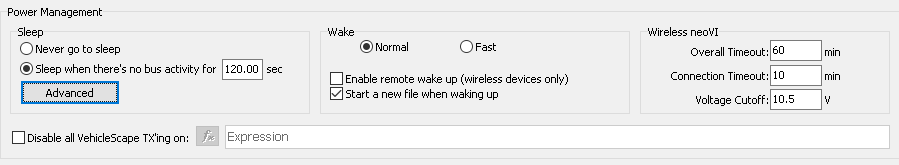 Power Management will put the neoVI device into a low power (sleep) state. VehicleScape DAQ has a few options. The first is "Never". This option will used what is configured in the hardware from neoVI 3G Explorer. By default the unit will not go into low power mode. Then next option is to If you choose to enable any type of sleep mode there is functionality for "Instant Wakeup". This means that the neoVI will not miss any messages (including the message that woke it up). Be aware that this state draws more power than normal sleep mode. See Figure 3. Never: Will use built in hardware settings configured from neoVI 3G Explorer (default is Sleep Mode disabled) On No Bus Activity: The last option will put the device to sleep once the bus is quiet. Note: Any Bus activity will wake up the neoVI.
