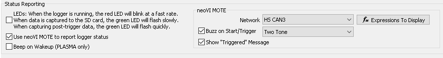 Beep in Wakeup (PLASMA only): Enabling this option will cause the neoVI PLASMA to beep When it wakes up.