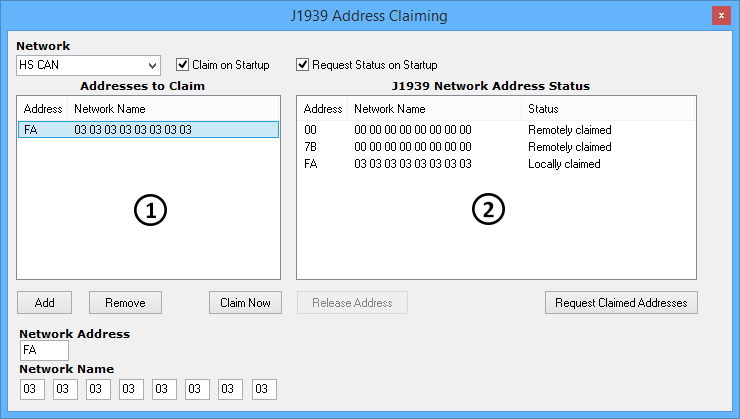 To claim a J1939 address for Vehicle Spy you must first fill in the desired one byte Network Address (in hexadecimal). The 8 bytes of the Network Name can also be filled in as needed. Next, click the "Add" button to add the Network Address and Name to the claim table on the left. Finally, click the "Claim Now" button to claim the address for Vehicle Spy. If "Claim on Startup" is enabled then Vehicle Spy will automatically claim the address in the table each time it goes online.