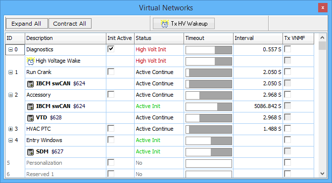 The Virtual Networks view (Figure 2) uses a table to give perspective from a VN point of view, instead of the messages/ECU point of view shown in Figure 1. Each VN is shown with its status, timeout, and interval information. ECU details for each VN can be toggled using the Expand/Contract All buttons. Click the Tx HV Wakeup button to transmit a high voltage wakeup frame on the SWCAN network.