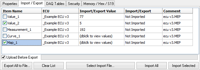 To export calibrations from MEP to a file, drag and drop items from the A2L file data item tree onto the Import/Export tab, click the "Export All to File" button, and save to a file name of your choice. If "Upload Before Export" is enabled, and VSpy is online in MEP mode with the ECU, then the MEP calibration data will be updated with an upload from the ECU before being saved in the file.