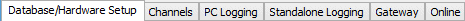 The tabs are generally used in order from left to right. A typical work flow might begin with setting up databases, then selecting channels to log, and then generating a script for hardware to run by itself.