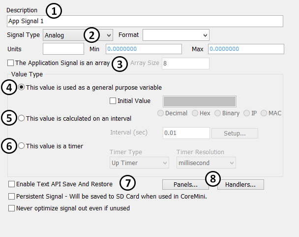 gives the option to create an application array. Application signal arrays work in a similar manner as with other programming languages. The Array Size determines how many elements are in the group. Each element is accessed by using an index number 0 to one less than the Array Size.