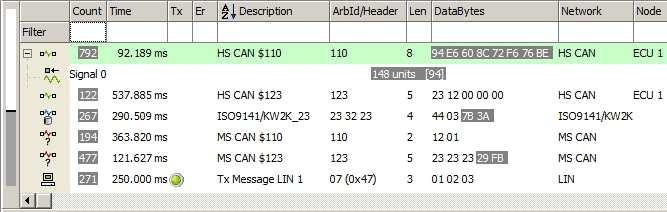 The Messages view buffer display (Figure 1) is a window into the world of network messages and signals received and transmitted by Vehicle Spy. Toolbars both above and below the display contain many features to adjust its appearance to fit desired needs.
