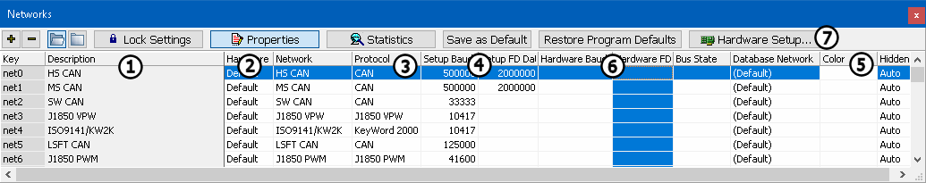 Each row in the table represents a network as shown in Figure 1. Networks can be added and deleted by clicking the + and - buttons in the upper left corner. Selecting the open folder will show all networks, selecting the closed folder will hide any unused networks. Each network can be configured using pulldown list selections in each of its columns within the table. Network changes can be stored as Vehicle Spy defaults by clicking the Save as Default button. Vehicle Spy comes with default networks and settings that can always be quickly restored back to the originals by clicking the Restore Program Defaults button.