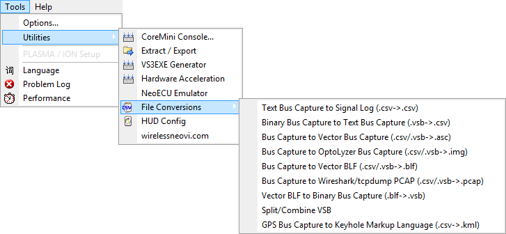 Vehicle Spy contains a few tools for converting file formats. To use them, select Tools -> Utilities -> File Conversions then select the conversion you want to perform (Figure 1). A window will pop up asking for a Vehicle Spy buffer file (CSV or VSB). Find the file and click Open. Another window will open for saving the converted file. Give the file a name and click Save.