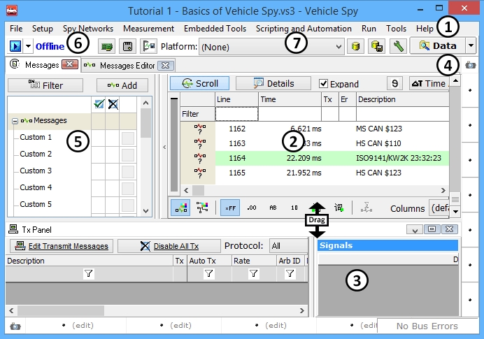Menu Bar (Figure 1:): Across the top of the Vehicle Spy interface is a standard format menu bar. The Menu Bar contains the heading for File, Setup, Spy Networks, Measurement, Embedded Tools, Scripting and Automation, Run, Tools, and Help. From the Menu Bar it is possible to access all the features of Vehicle Spy. The Menu bar also contains the Data button. This buttons allow for fast access to user data files. Working with Vehicle Spy, you will also see a set of tabs build up in the Menu Bar. These tabs are used to control the view displayed in the Main Workspace. When a view is chosen through the Menu Bar, a tab for that view will automatically appear. (In Figure 1, the Messages view tab is visible.) Tabs can be closed by clicking the "x" in the tab itself. Customizable tab sets allows each user to create an interface that best suits their individual needs.