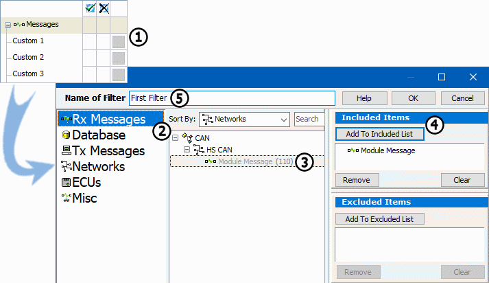 When using filters in Vehicle Spy, messages can also be excluded. In order for this to work properly, something must always be included before exclusion is possible. Vehicle Spy looks for included messages first and then excludes from that list. For example, removing our Module Message from the message traffic. First place a green checkmark next to the Network heading (Figure 3: