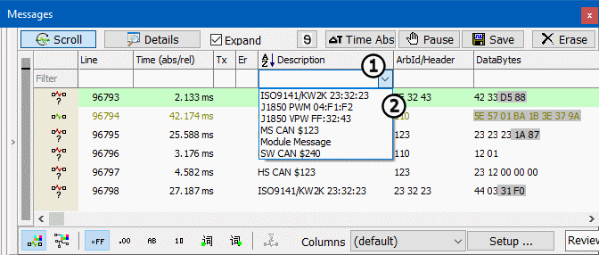 ).Select one of the listed descriptions and press Enter. Now the message description fills the space under the column heading and only messages with that description are shown. This filtering technique applies to the other columns such as ArbId/Header as well.