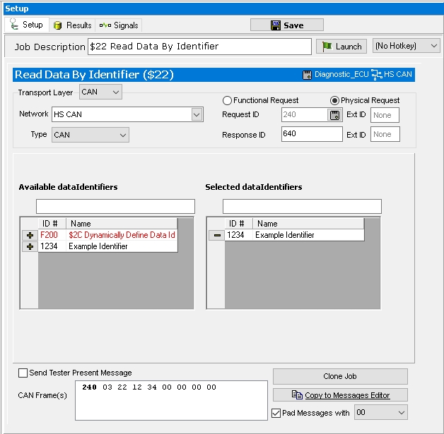 The next step is to setup the Read Data by Identifier service. If connected to a vehicle or a bench with access to an Identifier that can be read and written, use this. Following along, this example will be setup for an example Identifier read. Select an ECU to Physically address (and network if not chosen from a database) and the Indentifier number. For the Available dataIdentifier select ID# 1234 by clicking on the + button to the left of the ID #.
