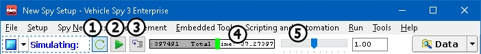 Run Simulation (Simulating: file name): Use this to replay a previously recorded buffer file without the need for network hardware. Mouse-over this choice to get a list of recently used simulation files or the option to run with No Replay File. Other simulation files can be selected by browsing for them or using Vehicle Spy Options. Simulation mode can be helpful for building Vehicle Spy files or reviewing buffers.