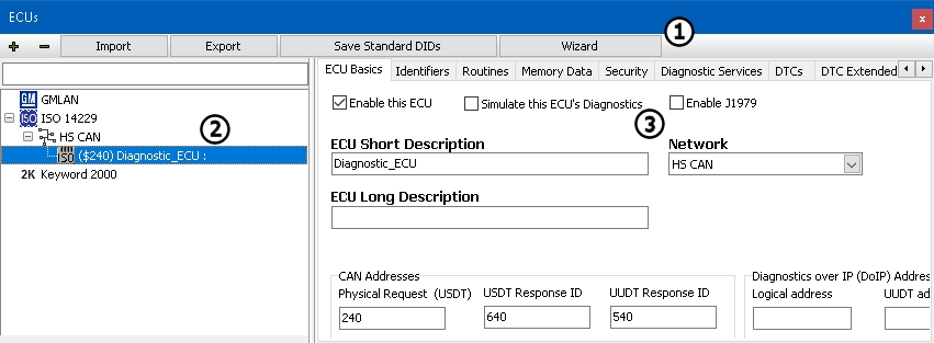 The top area (Figure 1:) has buttons for performing tasks common across many ECUs. The + and - buttons add and delete an ECU. When + button is clicked a diagnostic protocol for that ECU must be selected from GMLAN, ISO 14229, or Keyword 2000. Use the Import and Export buttons to work with other diagnostic database formats like .gdx, .mdx, .odx, .xls, etc. The Save Standard DIDs button saves changes made to GMLAN standard DIDs; this action affects all GMLAN type ECUs. The Save Database Changes button saves all changes made in the ECUs view to the diagnostics database file (*.gmd). Click the Wizard button to detect and resolve any address conflicts between ECUs that share the same diagnostic address on the same network. For example, consider a chime module and a radio module. Some vehicles have one or the other, so the ECU diagnostic address could be the same for both. Use the ECUs Wizard to let Vehicle Spy know which ECU is active to properly communicate with it.