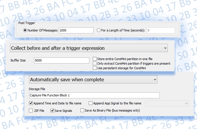 Flight recording is continuous monitoring of the network in a vehicle or on a vehicle bench for the purpose of observing or capturing issues over a period of time. Collection and the recording of network messages is very similar to the digital storage oscilloscopes where message buffers can be captured based on flexible triggering conditions. For example, collect 1000 messages before and after RPM goes above 5000.