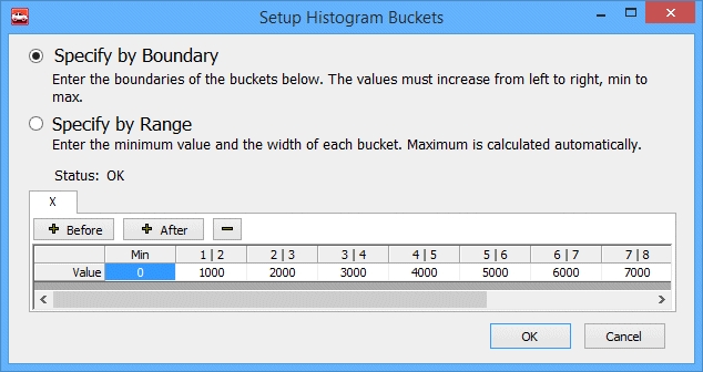 By default, all buckets are the same size, split evenly across the defined value range between Minimum Value and Maximum Value. If you check Use Non-Linear Bucket Spacing, you can then click the Setup Buckets... button to bring up the Setup Histogram Buckets dialog box (Figure 3). Here you can set customized buckets of variable size. Choose from defining the setup based on the boundary values between adjacent buckets, or specifying each bucket's minimum value and width.