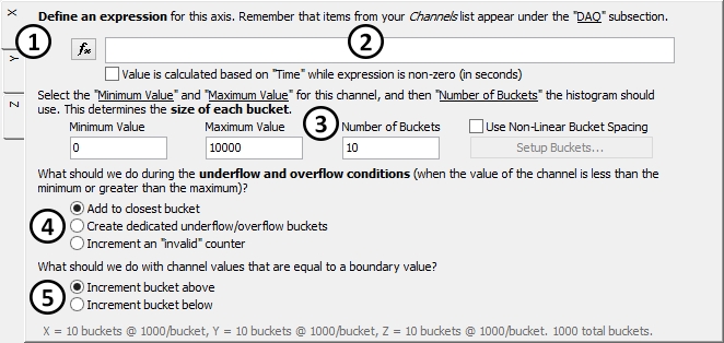 For example, the default settings shown in (Figure 2:) define a histogram where the lowest possible value is 0, the highest is 10,000 and the number of buckets is 10. This means that each bucket will have a size of 1,000. Remember that these values, which are summarized at the bottom of Figure 2, are set on a per-axis basis.