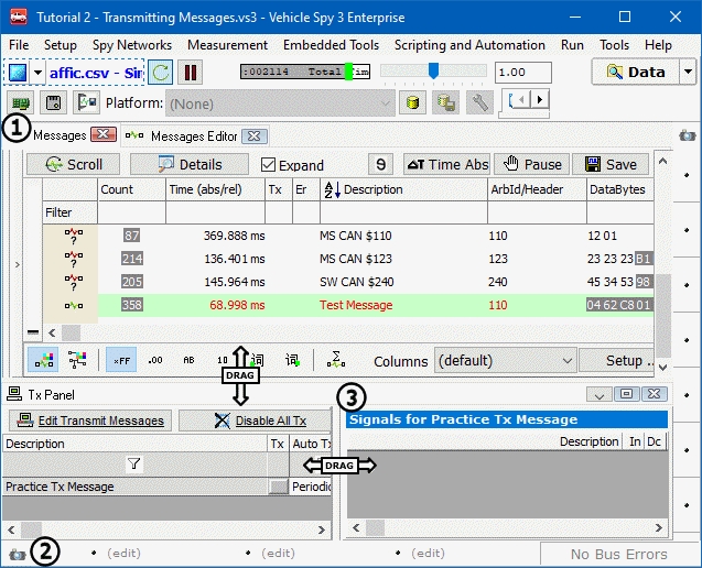 Back in the Vehicle Spy User Interface Introduction, Alternate Workspace panels were introduced docked at the bottom and the right of the user interface. In this exercise these panels will be used to view both the Tx Panel and Messages view simultaneously.