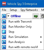Vehicle Spy can run in a several different modes: Run with Transmit, Run with MEP, Run Monitor Only, Run Simulation, Run Analysis, and Run with remote neoVI. These options are selected by clicking the drop down arrow (Figure 1) next to the blue Start/Stop button.