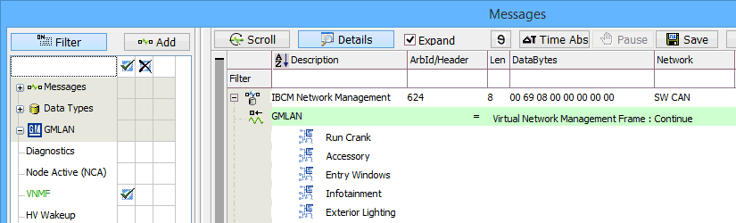 Use the Messages view to see VNMFs sent by each ECU and the VNs being controlled by that ECU. Figure 1 shows an example of an ECU using a VNMF to continue some VNs.