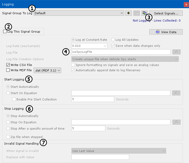 ). Start by choosing the desired signal group via the Signal Group to Log drop-down list. To change the signals in that group, click on Select Signals. The
