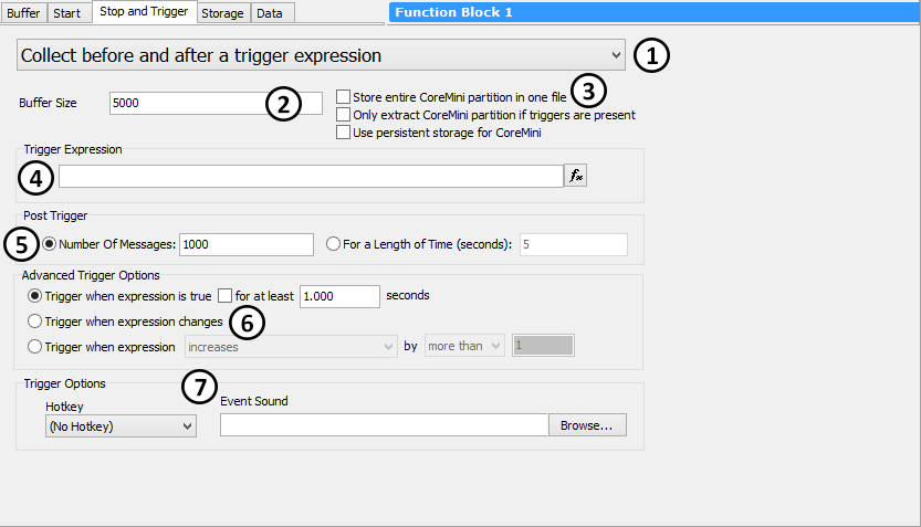 The Stop and Trigger Tab of a Capture Type Function Block is where the most important options are set for the block. It is here that we specify the primary method of data collection, determining when and how data will be captured. We also tell Vehicle Spy how much data we want to store, set trigger options for trigger-based captures, and set miscellaneous options for CoreMini standalone logging.