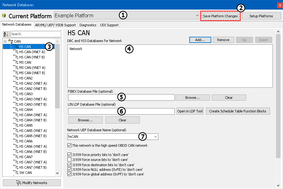 ). A platform is a group of network databases. Each network database defines all messages for a given network like HSCAN, MSCAN, etc. You can create multiple platforms and quickly switch between them as needed. Two buttons sit just to the right of the Current Platform drop down: Save Platform Changes & Setup Platforms (Figure 1: