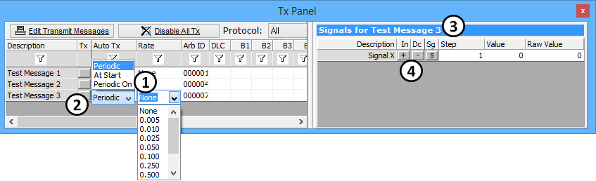 The Tx Panel is where manual or periodic message transmission is setup. Simply use the dropdowns to the right of the message description (Figure 1: