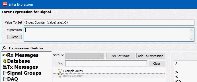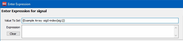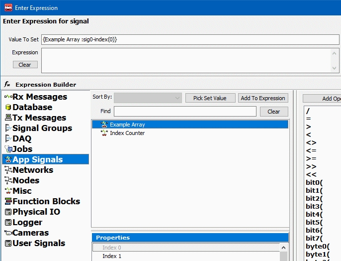 The above image shows the same setup as the image above, but with an Application Signal array instead of a standard Application Signal. Again, note the 'sig0' for the application signal, which is the key value for the application signal array, but also note the '-index(0)' afer the key value, and how it correlates with the Index 0 property in the field below. By replacing the static value with a counter, the index of the Array Application Signal can now be set dynamically. This is done by substituting the static index value of the Array Application Signal with the key value of the Standard Application Signal being used as the counter, as seen below.