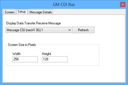 The Setup tab (Figure 2) is where the CGI message with Screen data is selected. This message must be defined in the receive table of the Messages Editor. The next option to setup is the size of the screen. The Width and Height are entered in the Screen Size and is entered in Pixel units.