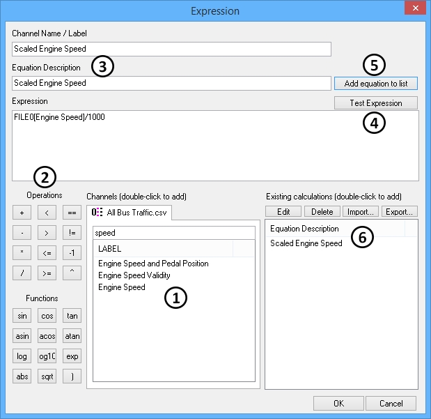Calculated channels can be edited and deleted by simply selecting them in the list and clicking the Edit or Delete buttons. The entire list of calculated channels can be imported and exported as *.exp files.