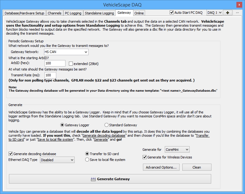 The remaining options and settings in this area, including those accessed through the Advanced Options... button, are the same as those found in the VehicleScape DAQ Standalone Logging Generate section. All of these options are enabled for a gateway logger, while those relevant to logging are grayed out if a standard gateway is selected.