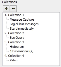 A full set of independent parameters and options is maintained for each collection within a Standalone Logging setup. To add a new collection, use the + button located in the upper left corner of the Standalone Logging Tab (Figure 1); to remove a collection, use the - button. Each collection is summarized in the collection list (Figure 1) with a brief summary of its key parameters. To select a collection to work with, simply click on it in the list.