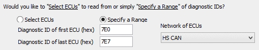 Specify a Range: When you choose this option, additional parameters will appear, as shown in Figure 2. Enter the start and end arbitration IDs for the range you want to collect from, and use the Network of ECUs drop-down box to change the network if necessary.