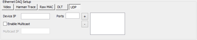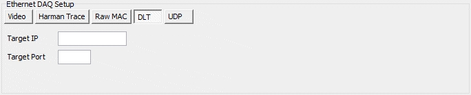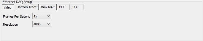 There are five different submethods that can be selected using buttons: Video, Harman Trace, Raw MAC, DLT, and UDP. The options under Ethernet DAQ Setup change depending on which of these is chosen. The five submethods are described and illustrated below.
