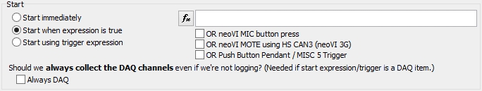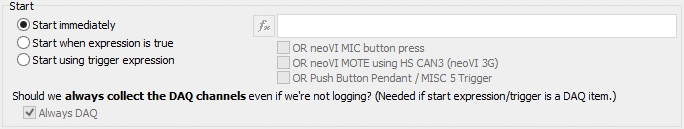 In VehicleScape DAQ Standalone Logging, the second set of options for the Message Capture method allows you to choose start options for the collection. There are three main options here, and which selection is made alters other options both in this area and the Stop section.