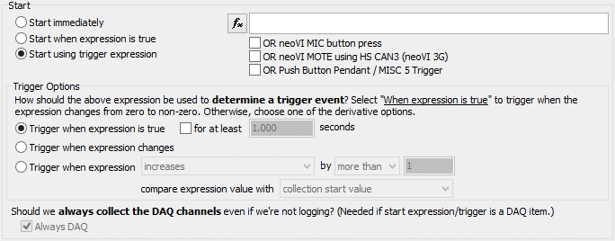 button to select an expression that must be true to start collection. You can also check boxes to enable collection to begin on the following events: