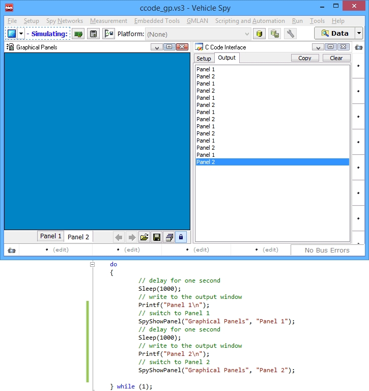 There are two functions that allow you to switch the current panel in a Graphical Panel. These are SpyShowPanel and SpyShowPanelW. These function take two strings. The first string is the window name and the second is the panel you wish to show. The window string can be NULL or blank and the function will operate on the first graphical panel window visible. The difference between ShowPanel and ShowPanelW is that ShowPanelW takes unicode characters.