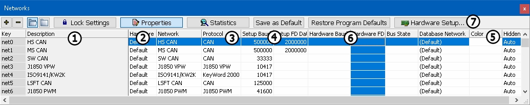 The Vehicle Spy main menu selections Setup> Hardware and Spy Networks> Networks basically have the same interface and features related to networks. The main difference is that the Networks selection has an additional Network Statistics display mode. The common interface and features are described here. (Figure 1 is the Properties display mode if using the Networks selection.)