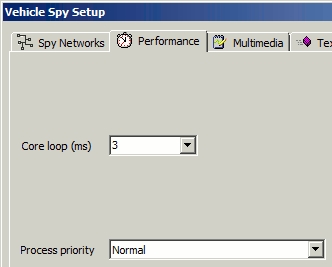 The Tools -> Options -> Performance tab has settings that tell a computer how fast to run Vehicle Spy. The defaults are 3 milliseconds for Core Loop time and a normal Process Priority. Lower loop times and higher process priorities will make Vehicle Spy try to run faster. Making Vehicle Spy run faster can adversely affect the performance of other programs running on the computer depending upon the program and the power of the computer.
