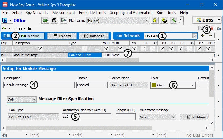 &#xNAN;*Note: Depending on preference, message information such as Description or Arb ID can be entered directly into the grid or in the Setup dialog. The changes made in one area will also occur in the other.