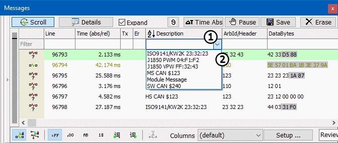 Besides setting up custom filters, there are other ways to filter in Vehicle Spy. Column filters provide a fast and efficient way to sort through hundreds of messages without setting up a custom filter.