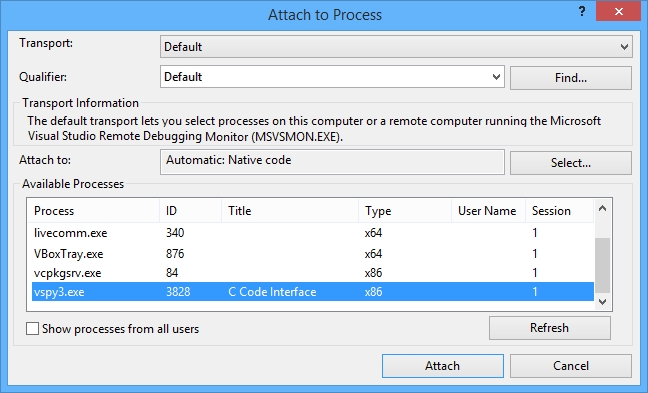 It is possible to debug your code using the debugger in Visual Studio. After rebuilding your project, select Tools>Attach to Process.... from the main menu of Visual Studio. Select Vspy3.exe and click on Attach.