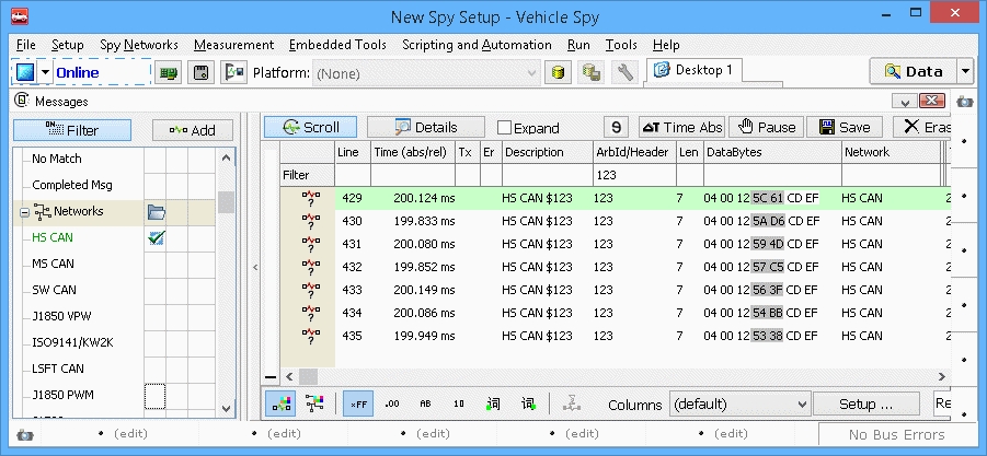 Now that we have the data from the card, all that is left is to review the data. There are two ways to review the data captured in Vehicle Spy. The first is to select one of the *.VSB files that was extracted from Windows Explorer and drag it into the Messages view of Vehicle Spy. The other is to go to "File", then "Review Buffer". From the Open dialog, select the *.VSB that is to be looked at. Either method will fill the Messages view with the data that was collected from the capture. If you have a database configured, the messages will be decoded. Vehicle Spy's filters can also be used to narrow down the traffic so only the messages of interest will be shown. In your data stream, you should see the RPM Request. If you were connected to a vehicle that supports J1979 on HS CAN, you should also have a response with RPM data.